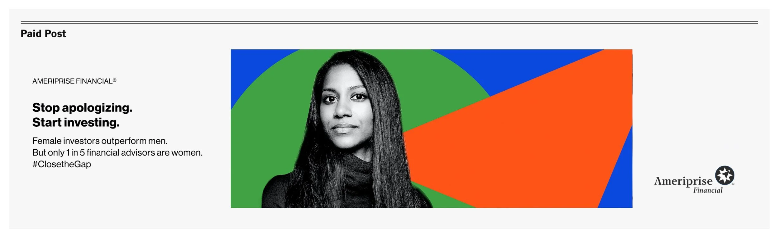 It’s been illegal to pay women less than men since 1963. But the Gender Pay Gap is still a reality, full of glass ceilings and velcro floors. And yet, statistically, women make better investors. Women hedge fund managers outperform men by almost 6 percentage points. Women’s portfolios gain 1.4% more than men’s portfolios. That’s why Ameriprise thinks enough is enough. It’s time to get more women to start investing (and for more women to enter the financial profession). It’s time to close the Confidence Gap. Close the Pay Gap. Close the Wealth Gap.